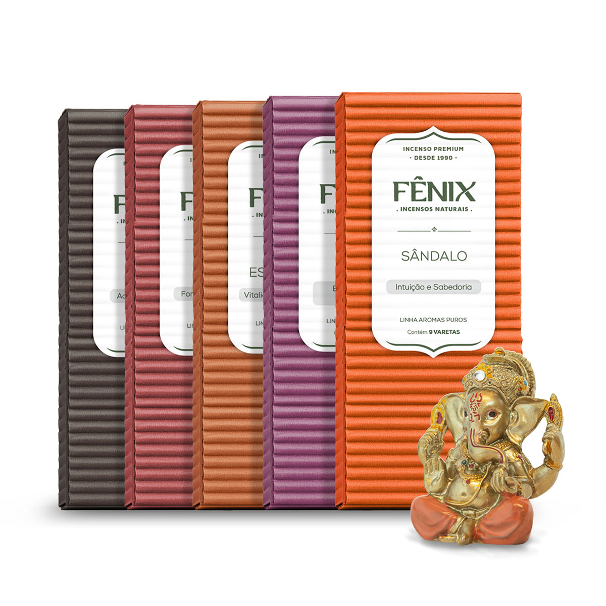 Embalagem: 5 caixas de incensos artesanais e Ganeshinha (cor sortida). Cada caixa de incenso vem com 9 varetas